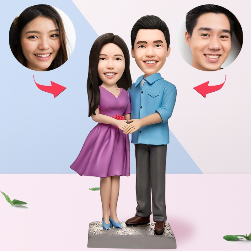 對手牽著手的定制搖頭軟陶人偶,添加文字