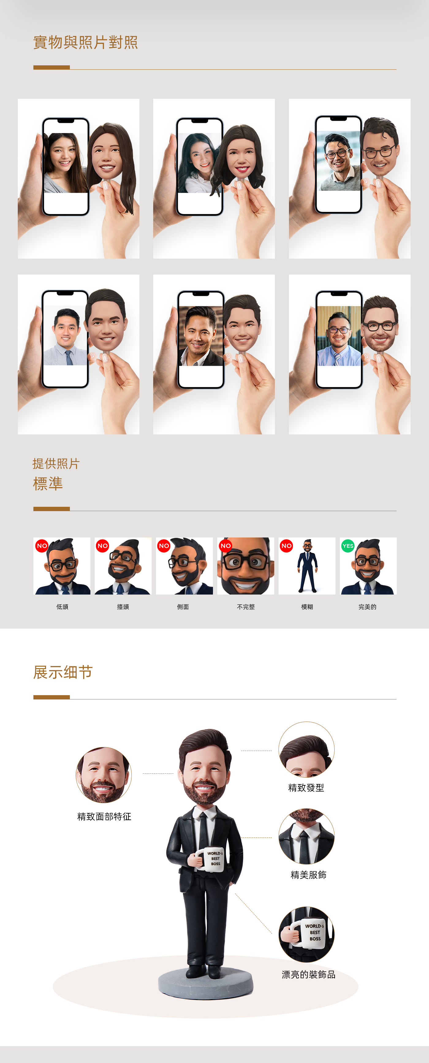 本產品只製作照片中的人物,不會製作照片中包括的其他大型裝飾品,如桌椅、樂器、動物等