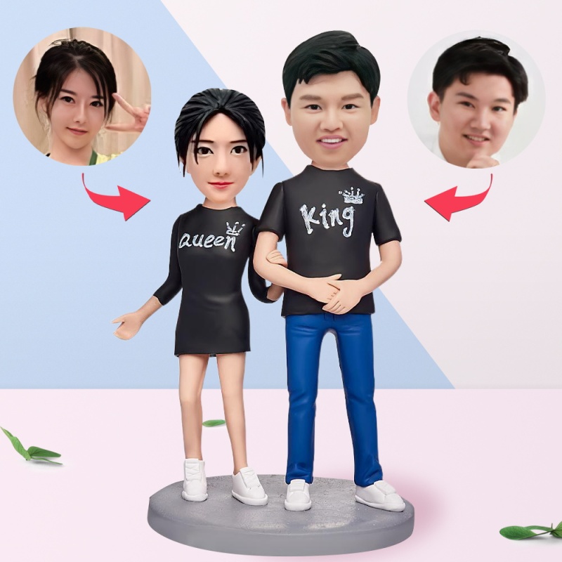 女王和國王情侶襯衫定制搖頭軟陶人偶,添加文字